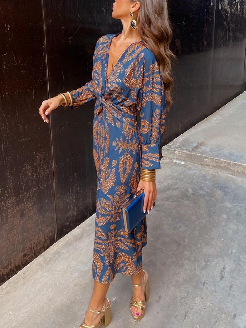 Den flatterende V-hals og lange ærmer skaber balance mellem afslappet og formelt.